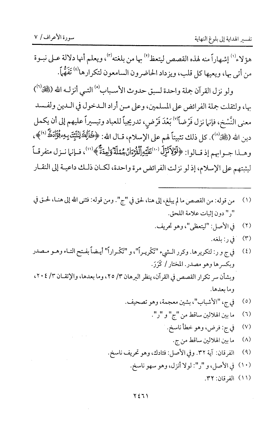 كل ذلك تثبيتاً لهم على الإسلام، قال الله: {كَذَلِكَ لِنُثَبِّتَ بِهِ فُؤَادَكَ} [الفرقان: 32]، وهذا جوابهم إذا قالوا: {لَوْلاَ نُزِّلَ عَلَيْهِ القرآن جُمْلَةً وَاحِدَةً} [الفرقان: 32]، فإنما نزل متفرقاً ليثبتهم على الإسلام، إذ لو نزلت الفرائض مرة واحدة، لكان ذلك داعية إلى النقار