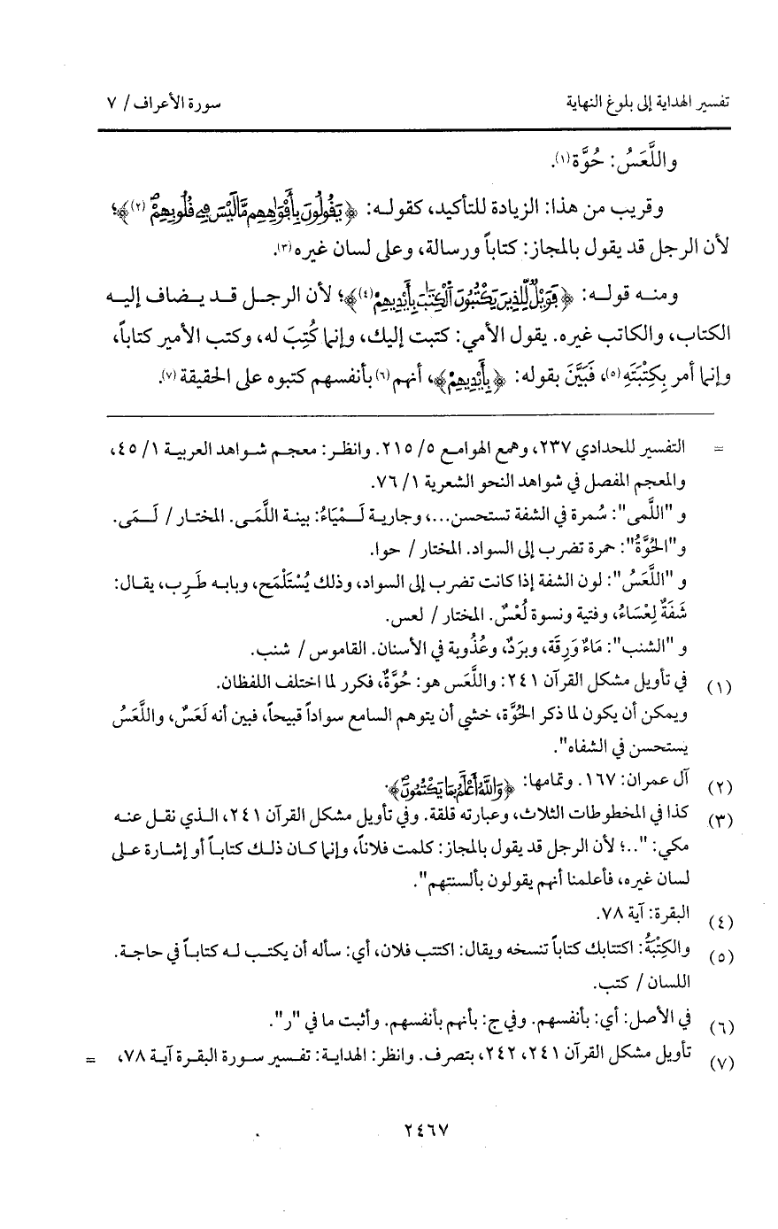 ومنه قوله: {فَوَيْلٌ لِّلَّذِينَ يَكْتُبُونَ الكتاب بِأَيْدِيهِمْ} [البقرة: 79]؛ لأن الرجل قد يضاف إليه الكتاب، والكاتب غيره. يقول الأمي: كتبت إليك، وإنما كُتِبَ له، وكتب الأمير كتاباً، وإنما أمر بِكِتُبَتَهِ، فَبَيَّنَ بقوله: {بِأَيْدِيهِمْ}، أنهم بأنفسهم كتبوه على الحقيقة.