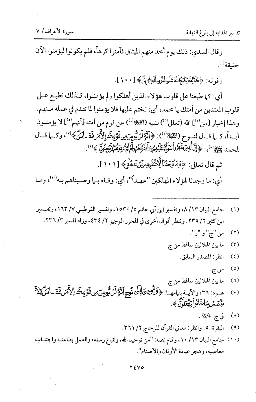 أي: كما طبعنا على قلوب هؤلاء الذين أهلكوا ولم يؤمنوا، كذلك نطبع على قلوب المعتدين من أمتك يا محمد، أي: نختم عليها فلا يؤمنوا لما تقدم في عمله منهم. وهذا إخبار [من] الله (تعالى) لنبيه (عليه السلام) عن قوم من أمته [أنهم] لا يؤمنون أبداً، كما قال لنوح (عليه السلام): {أَنَّهُ لَن يُؤْمِنَ مِن قَوْمِكَ إِلاَّ مَن قَدْ آمَنَ} [هود: 36]، وكما قال لمحمد A،: { إِنَّ الذين كَفَرُواْ سَوَآءٌ عَلَيْهِمْءَأَنذَرْتَهُمْ أَمْ لَمْ تُنْذِرْهُمْ لاَ يُؤْمِنُونَ} [البقرة: 6].