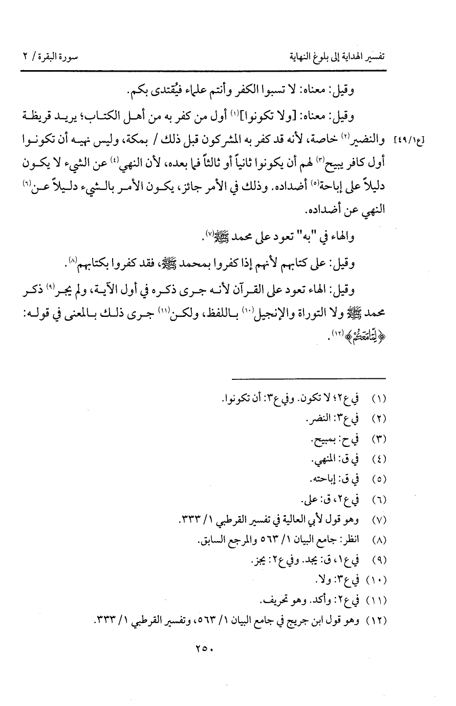وقيل: معناه: [ولا تكونوا] أول من كفر به من أهل الكتاب؛ يريد قريظة والنضير خاصة، لأنه قد كفر به المشركون قبل ذلك / بمكة، وليس نهيه أن تكونوا أول كافر يبيح لهم أن يكونوا ثانياً أو ثالثاً فما بعده، لأن النهي عن الشيء لا يكون دليلاً على إباحة أضداده. وذلك في الأمر جائز، يكون الأمر بالشيء دليلاً عن النهي عن أضداده.