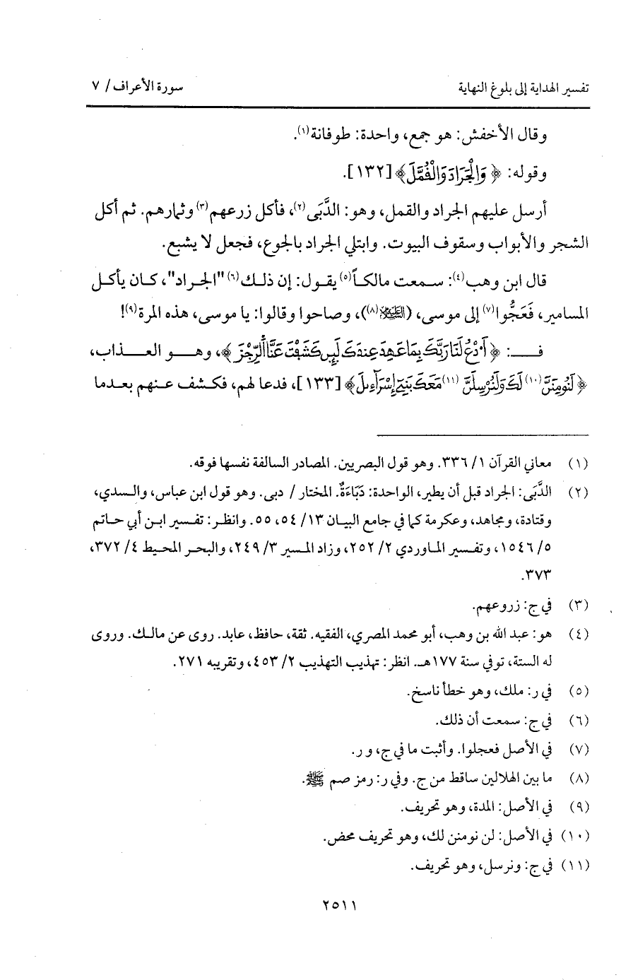 قال ابن وهب: سمعت مالكاً يقول: إن ذلك " الجراد "، كان يأكل المسامير، فَعَجُّوا إلى موسى، (عليه السلام)، وصاحوا وقالوا: يا موسى، هذه المرة!