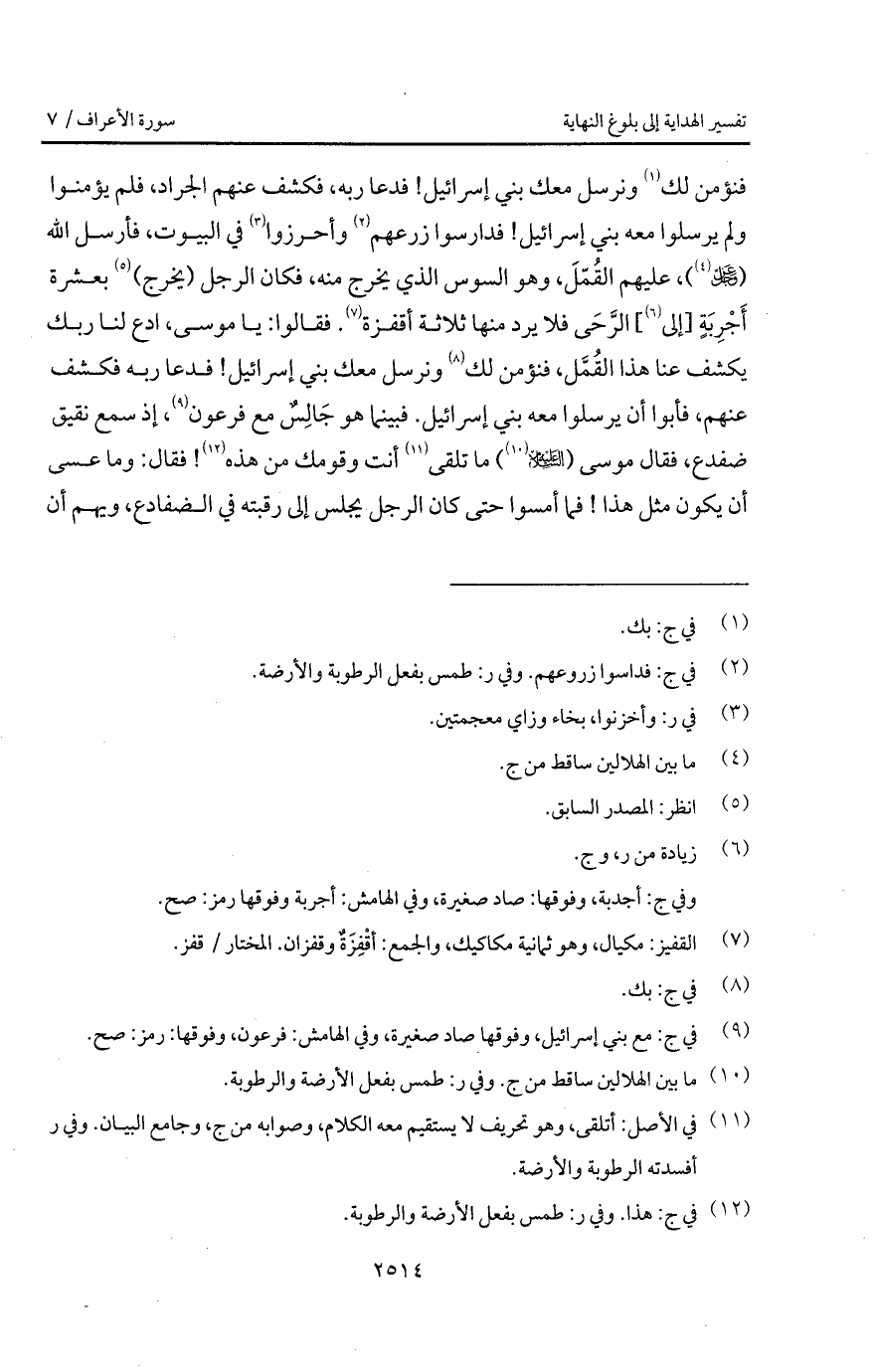 فنؤمن لك ونرسل معك بني إسرائيلّ! فدعا ربه، فكشف عنهم الجراد، فلم يؤمنوا ولم يرسلوا معه بني إسرائيل! فدارسوا زرعهم وأحرزوا في البيوت، فأرسل الله ( D) ، عليهم القُمّلَ، وهو السوس الذي يخرج منه، فكان الرجل (يخرج) بعشرة أَجْرِبَةٍ [إِلى] الرَّحَى فلا يرد منها ثلاثة أقفزة. فقالوا: يا موسى، ادع لنا ربك يكشف عنا هذا القُمَّل، فنؤمن لك ونرسل معك بني إسرائيل! فدعا ربه فكشف عنهم، فأبوا أن يرسلوا معه بني إسرائيل. فينما هو جَالِسٌ مع فرعون، إذ سمع نقيق ضفدع، فقال موسى (عليه السلام) ما تلقى أنت وقومك من هذه! فقال: وما عسى أن يكون مثل هذا! فما أمسوا حتى كان الرجل يجلس إلى رقبته في الضفادع، ويهم أن