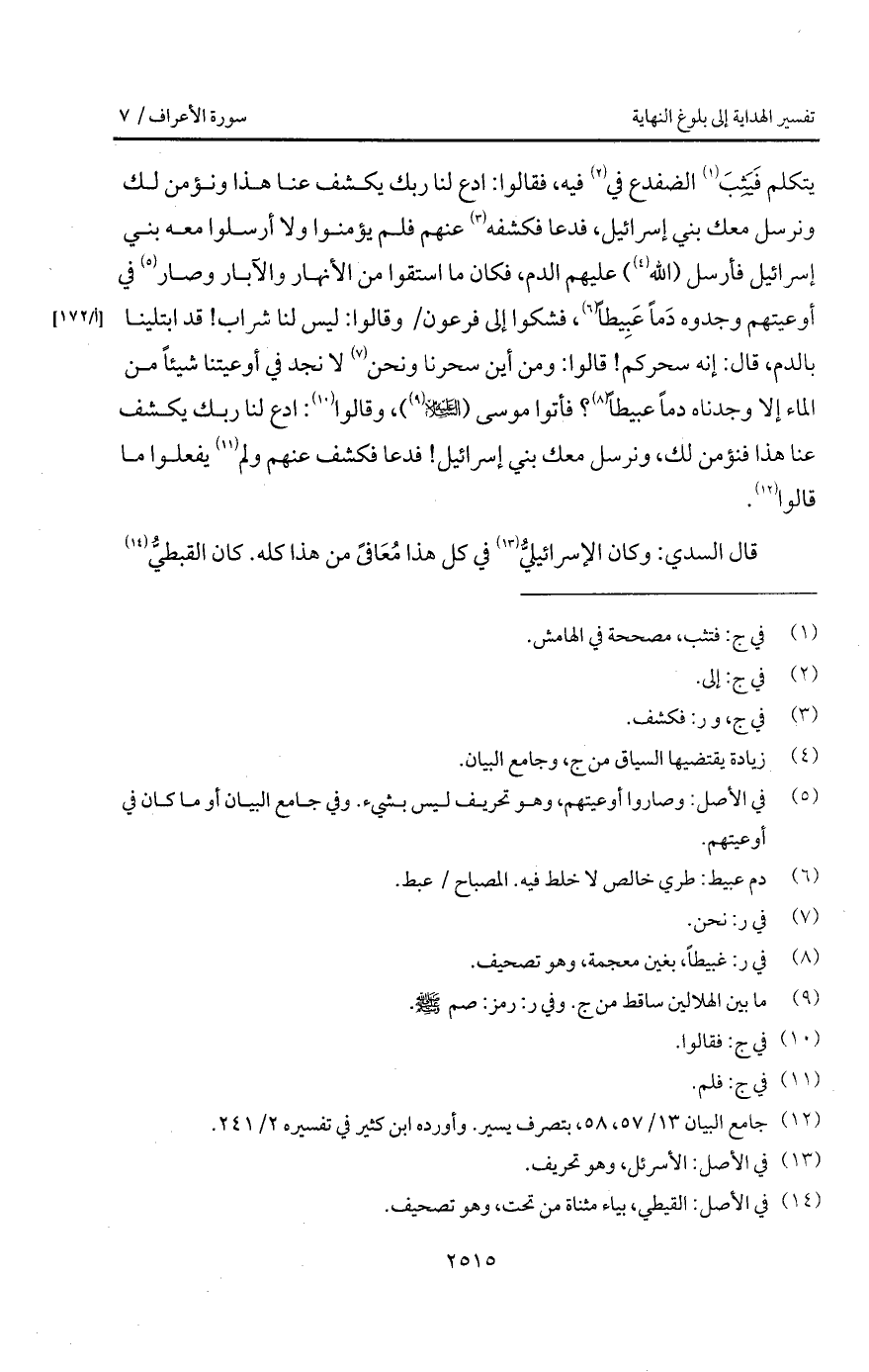 يتكلم فَيَثِبَ الضفدع في فيه، فقالوا: ادع لنا ربك يكشف عنا هذا ونؤمن لك ونرسل معك بني إسرائيل، فدعا فكشفه عنهم فلم يؤمنوا ولا أرسلوا معه بني إسرائيل فأرسل (الله) عليهم الدم، فكان ما استقوا من الأنهار والآبار وصار في أوعيتهم وجدوه دَماً عَبِيطاً، فشكوا إلى فرعون/ وقالوا: ليس لنا شراب! قد ابتلينا بالدم، قال: إنه سحركم! قالوا: ومن أين سحرنا ونحن لا نجد في أوعيتنا شيئاً من الماء إلا وجدناه دماً عبيطاً؟ فأتوا موسى (عليه السلام)، وقالوا: ادع لنا ربك يكشف عنا هذا فنؤمن لك، ونرسل معك بني إسرائيل! فكشف عنهم ولم يفعلواما قالوا.