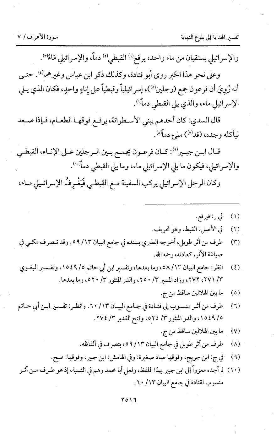 وعلى نحوة هذا الخبر روى أبو قتادة، وكذلك ذكر ابن عباس وغيرهما. حتى أنه رُوِيَ أن فرعون جمع (رجلين)، إسرائيلياً وقبطياً على إِناءٍ واحدٍ، فكان الذي يلي الإسرائيلي ماء، والذي يلي القطبي دماً.
