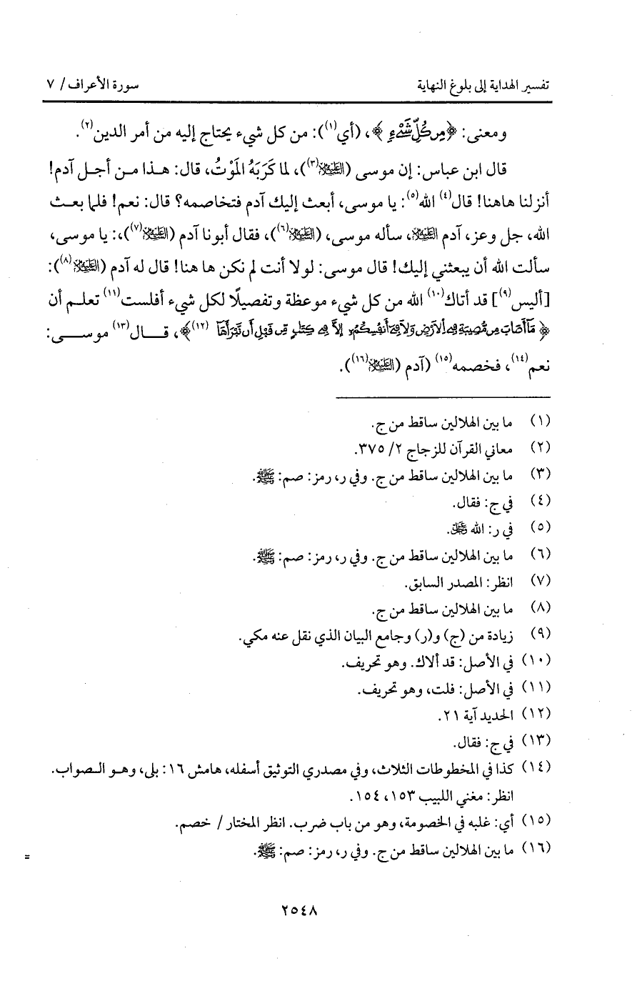 قال ابن عباس: إن موسى (عليه السلام)، لما كَرَبَهُ المَوْتُ، قال: هذا من أجل آدم! أنزلنا هاهنا! قال الله: يا موسى، أبعث إليك آدم فتخاصمه؟ قال: نعم! فلما بعث الله، جل وعز، آدم عليه السلام، سأله موسى، (عليه السلام)، فقال أبونا آدم (عليه السلام)،: يا موسى، سألت الله أن يبعثني إليك! قال موسى لولا أنت لم تكن ها هنا! قال له آدم (عليه السلام): [أليس] قد أتاك الله من كل شيء موعظة وتفصيلاً لكل شيء أفلست تعلم أن {مَآ أَصَابَ مِن مُّصِيبَةٍ فِي الأرض وَلاَ في أَنفُسِكُمْ إِلاَّ فِي كتاب مِّن قَبْلِ أَن نَّبْرَأَهَآ} [الحديد: 22]، قال موسى: نعم، فخصمه (آدم عليه السلام).
