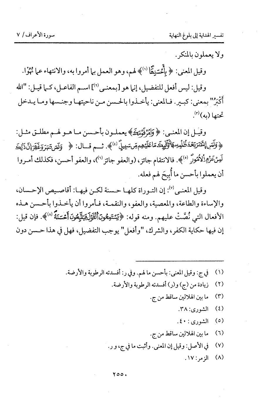 وقيل: ليس أفعل للتفضيل، إنما هو [بمعنى] اسم الفاعل، كما قيل: " الله أَكْبَرُ " بمعنى: كبير. فالمعنى: يأخذوا بالحسن من ناحيتها وجنسها وما يدخل تحتها (به).