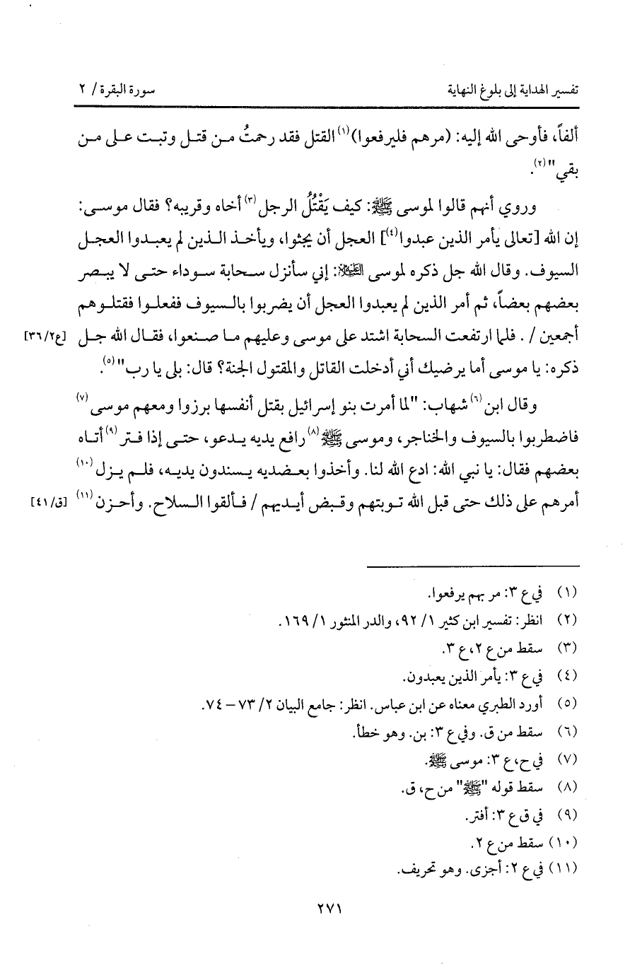 وقال ابن شهاب: " لما أمرت بنو إسرائيل بقتل أنفسها برزوا ومعهم موسى فاضطربوا بالسيوف والخناجر، وموسى A رافع يديه يدعو، حتى إذا فتر أتاه بعضهم فقال: با نبي الله: ادع الله لنا. وأخذوا بعضديه يسندون يديه، فلم يزل أمرهم على ذلك حتى قبل الله توبتهم وقبض أيديهم / فألقوا السلاح. وأحزن