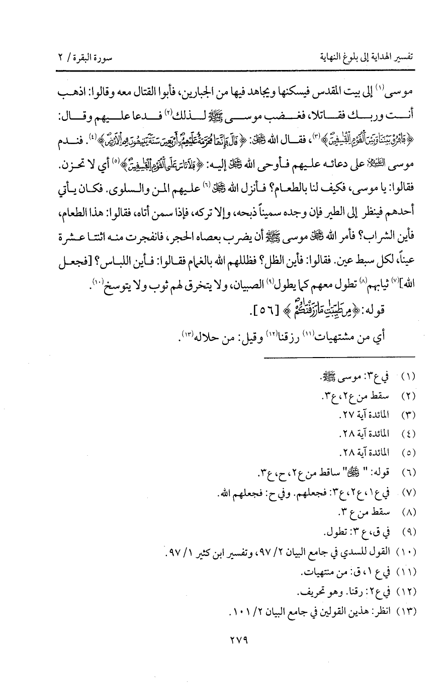 موسى إلى بيت المقدس فيسكنها ويجاهد فيها من الجبارين، فأبوا القتال معه وقالوا: اذهب أنت وربك فقاتلا، فغضب موسى A لذلك فدعا عليهم وقال: {فافرق بَيْنَنَا وَبَيْنَ القوم الفاسقين} [المائدة: 25]، فقال الله D: { قَالَ فَإِنَّهَا مُحَرَّمَةٌ عَلَيْهِمْ أَرْبَعِينَ سَنَةً يَتِيهُونَ فِي الأرض} [المائدة: 26]. فندم موسى عليه السلام على دعائه عليهم فأوحى الله D إليه: {فَلاَ تَأْسَ عَلَى القوم الفاسقين} [المائدة: 26] أي لا تحزن. فقالوا: يا موسى، فكيف لنا بالطعام؟ فأنزل الله D عليهم المن والسلوى. فكان يأتي أحدهم فينظر إلى الطير فإن وجده سميناً ذبحه، وإلا تركه، فإذا سمن أتاه، فقالوا: هذا الطعام، فأين الشراب؟ فأمر الله D موسى A أن يضرب بعصاه الحجر، فانفجرت منه اثنتا عشرة عيناً، لكل سبط عين. فقالوا: فأين الظل؟ فظللهم الله بالغمام فقالوا: فأين اللباس؟ [فجعل الله] ثيابهم تطول معهم كما يطول الصبيان، ولا يتخرق لهم ثوب ولا يتوسخ.