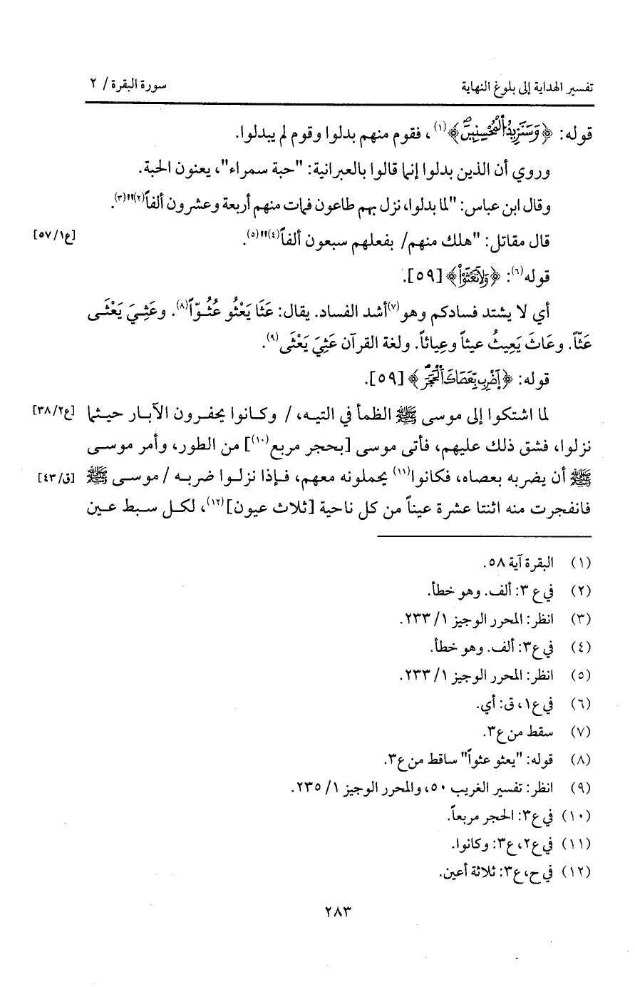 لما اشتكوا إلى موسى A الظمأ في التيه، / وكانوا يحفرون الآبار حيثما نزلوا، فشق ذلك عليهم، فأتى موسى [بحجر مربع] من الطور، وأمر موسى A أن يضربه بعصاه، فكانوا يحملونه معهم، فإذا نزلوا ضربه / موسى A فانفجرت منه اثنتا عشرة عيناً من كل ناحية [ثلاث عيون]، لكل سبط عين