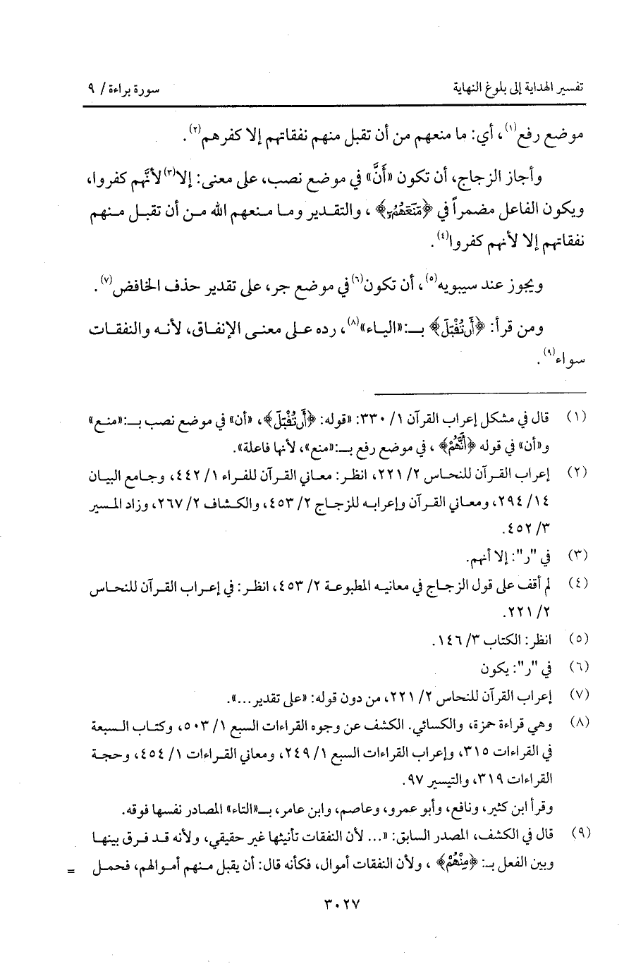 وأجاز الزجاج، أن تكون " أَنَّ " في موضع نصب، على معنى: إلا لأنَّهم كفروا، ويكون الفاعل مضمراً في {مَنَعَهُمْ}، والتقدير ومامنعهم الله من أن تقبل منهم نفقاتهم إلا لأنهم كفروا.