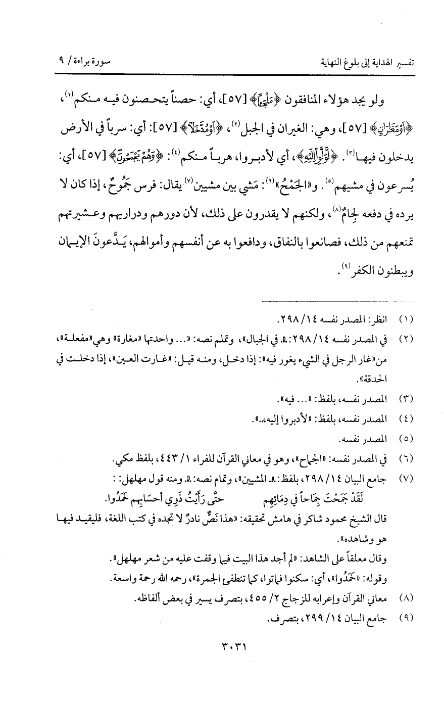 ولو يجد هؤلاء المنافقون {مَلْجَئاً}، أي: حصناً يتحصنون فيه منكم، {أَوْ مَغَارَاتٍ}، وهي: الغيران في الجبل، {أَوْ مُدَّخَلاً}: أي: سرباً في الأرض يدخلون فيها. {لَّوَلَّوْاْ إِلَيْهِ}، أي لأدبروا، هرباً منك: {وَهُمْ يَجْمَحُونَ}، أي: يُسرعون في مشيهم. و " الجَمْحُ ": مَشي بين مشيين يقال: فرس جَمُوحٌ، إذا كان لا يرده في دفعه لجِامٌ، ولكنهم لا يقدرون على ذلك، لأن دورهم ودراريهم وعشيرتهم تمنعهم من ذلك، فصانعوا بالنفاق، ودافعوا به عن أنفسهم وأموالهم، يَدَّعونَ الإيمان ويبطنون الكفر.