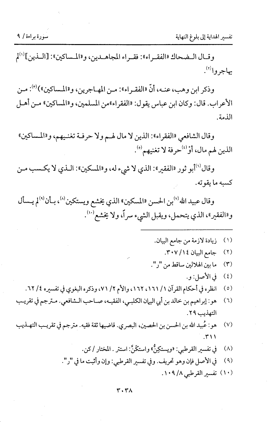 وقال الشافعي " الفقراء ": الذين لا مال لهم ولا حرفة تغنيهم، و " المساكين " الذين لهم مال، أوْ حرفة لا تغنيهم.