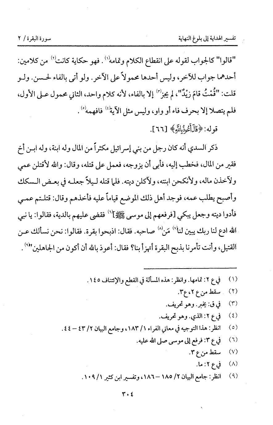 ذكر السدي أنه كان رجل من بني إسرائيل مكثراً من المال وله ابنة، وله ابن أخ فقير من المال، فخطب إليه، فأبى أن يزوجه، فعمل على قتله، وقال: والله لأقتلن عمي ولآخذن ماله، ولأنكحن ابنته، ولآكلن ديته. فلما قتله ليلاً جعله في بعض السكك وأصبح يطلب عمه، فوجد أهل ذلك الموضع قياماً عليه فأخذهم وقال: قتلتم عمي فأدوا ديته وجعل يبكي [فرفعهم إلى موسى A] فقضى عليهم بالدية، فقالوا: يا نبي الله ادع لنا ربك يبين لنا مَن صاحبه. فقال: اذبحوا بقرة. فقالوا: نحن نسألك عن القتيل، وأنت تأمرنا بذبح البقرة أتهزأ بنا؟ فقال: أعوذ بالله أن أكون من الجاهلين ".