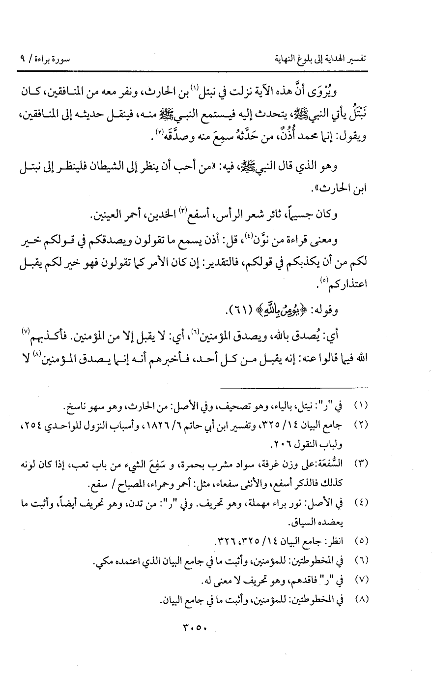 ويُرْوَى " أنَّ هذه الآية نزلت في نبتل بن الحارث، ونفر معه من المنافقين، كان نَبْتَلُ يأتي النبي A، يتحدث إليه فيستمع النبي A منه، فنيقل حديثه إلى المنافقين، ويقول: إنما محمد أُذُنٌ، من حَدَّثهُ سمِعَ وصدَّقَه.