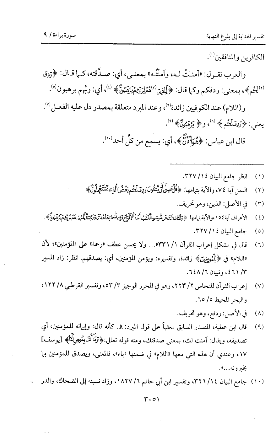 والعرب تقول: " آمنتُ له، وآمنْتُه " بمعنى، أي: صدَّقته، كما قال: {رَدِفَ لَكُم} [النمل: 72]، بمعنى: ردفكم وكما قال: {لِّلَّذِينَ هُمْ لِرَبِّهِمْ يَرْهَبُونَ} [الأعراف: 154]، أي: ربَّهم يرهبون.
