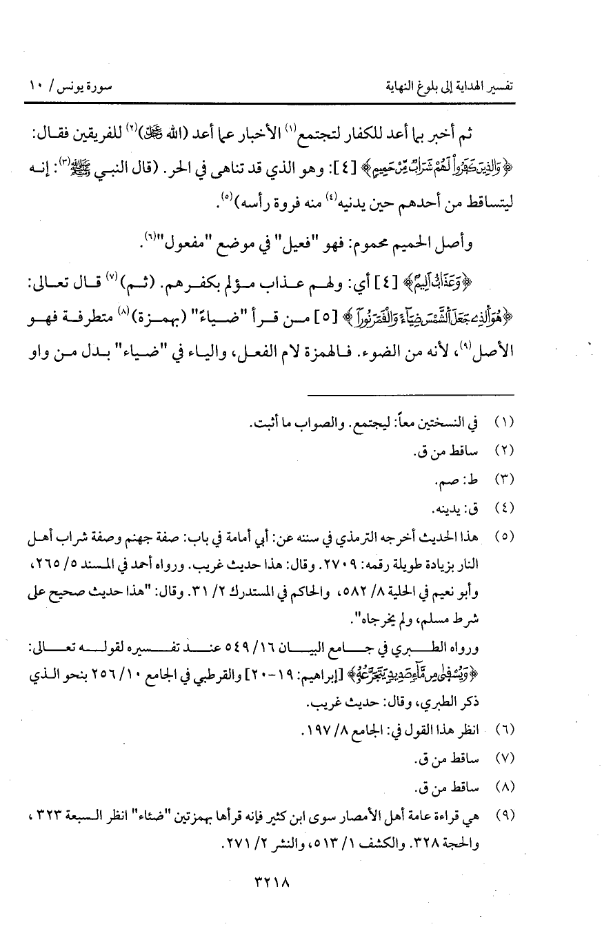 {وَعَذَابٌ أَلِيمٌ} أي: ولهم عذاب مؤلم بكفرهم. (ثم) قال تعالى: {هُوَ الذي جَعَلَ الشمس ضِيَآءً والقمر نُوراً} من قرأ " ضياءً " (بهمزة) متطرفة فهو الأصل، لأنه من الضوء. فالهمزة لام الفعل، والياء في " ضياء " بدل من واو