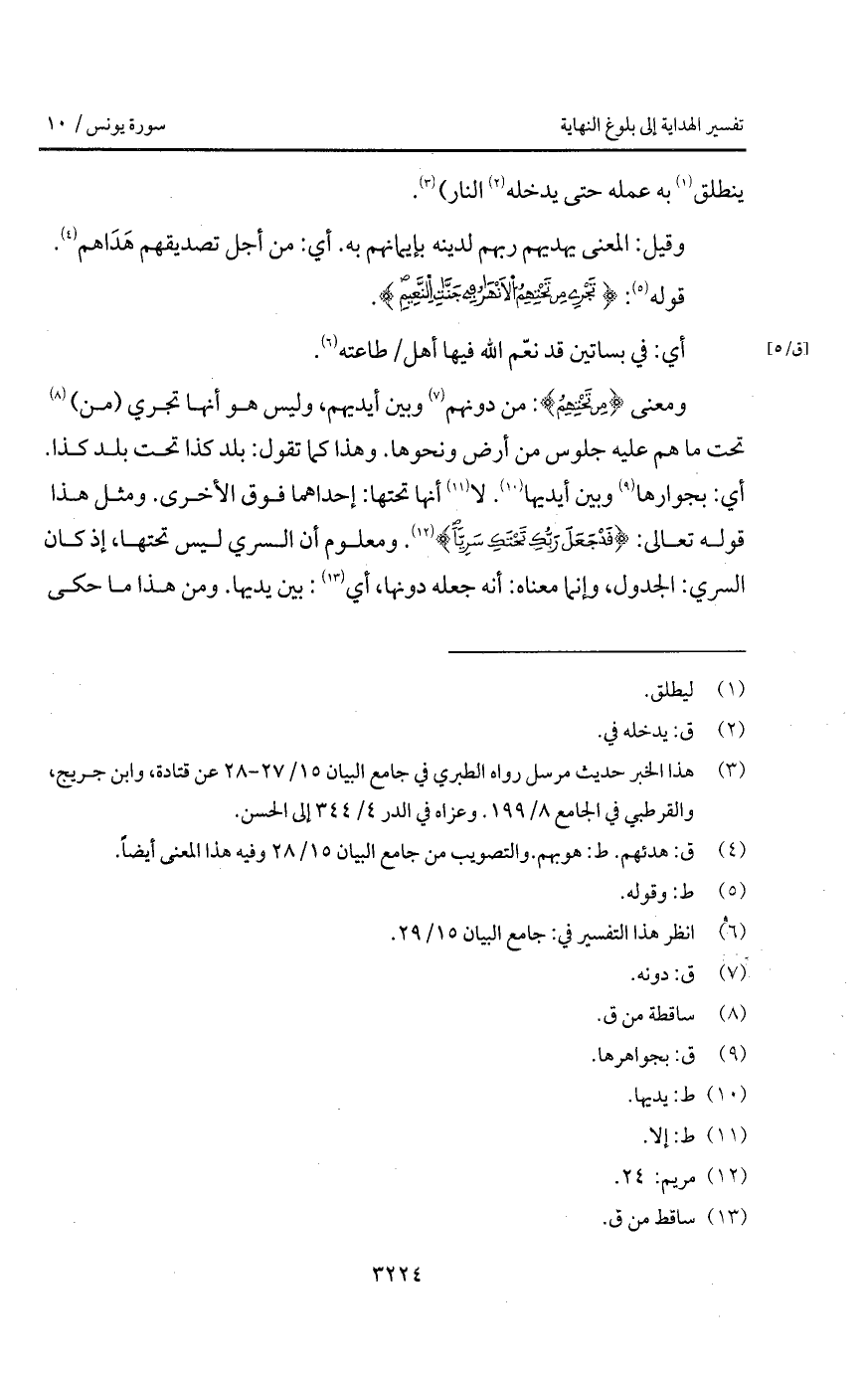 ومعنى {مِن تَحْتِهِمُ}: من دونهم وبين أيديهم، وليس هو أنها تجري (من) تحت ما هم عليه جلوس من أرض ونحوها. وهذا كما تقول: بلد كذا تحت بلد كذا. أي: بجوارها وبين أيديها. لا أنها تحتها: إحداهما فوق الأخرى. ومثل هذا قوله تعالى: {قَدْ جَعَلَ رَبُّكِ تَحْتَكِ سَرِيّاً} [مريم: 24]. ومعلوم أن السري ليس تحتها، إذ كان السري: الجدول، وإنما معناه: أنه جعله دونها، أي: بين يديها. ومن هذا ما حكى