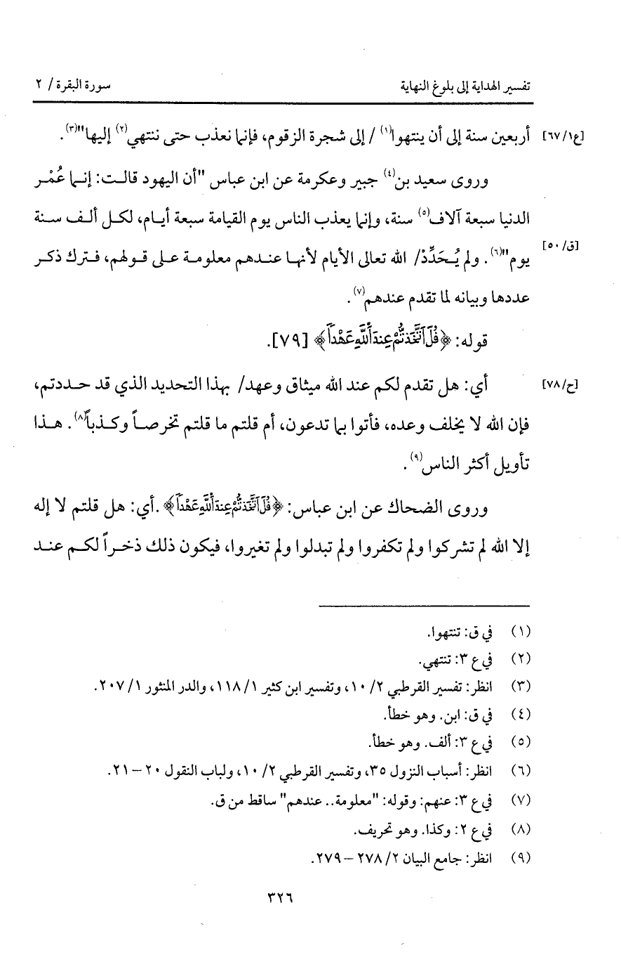 وروى سعيد بن جبير وعكرمة عن ابن عباس " أن اليهود قالت: إنما عُمْر الدنيا سبعة آلاف سنة، وإنما يعذب الناس يوم القيامة سبعة أيام، لكل ألف سنة يوم ". ولم يُحَدِّدْ / الله تعالى الأيام لأنها عندهم معلومة على قولهم، فترك ذكر عددها وبيانه لما تقدم عندهم.