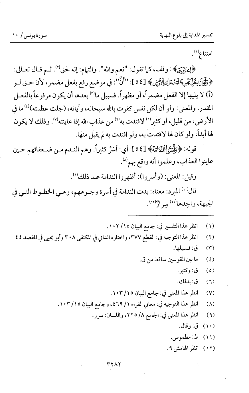 {إِي وربي}: وقف، كما تقول: " نعم والله ". والتمام: إنه لحق. ثم قال تعالى: {وَلَوْ أَنَّ لِكُلِّ نَفْسٍ ظَلَمَتْ مَا فِي الأرض}: " أَنَّ ": في موضع رفع فعل مضمر، لأن حق لو (أ) لا يليها إلا الفعل مضمراً، أو مظهراً. فسبيل ما بعدها أن يكون مرفوعاً بالفعل المقدر. والمعنى: ولو أن لكل نفس كفرت بالله سبحانه، وآياته، (جلت عظمته) ما في الأرض، من قليل، أو كثير لافتدت به من عذاب الله إذا عاينته. وذلك لا يكون لها أبداً، ولو كان لها لافتدت به، ولو افتدت به لم يقبل منها.
