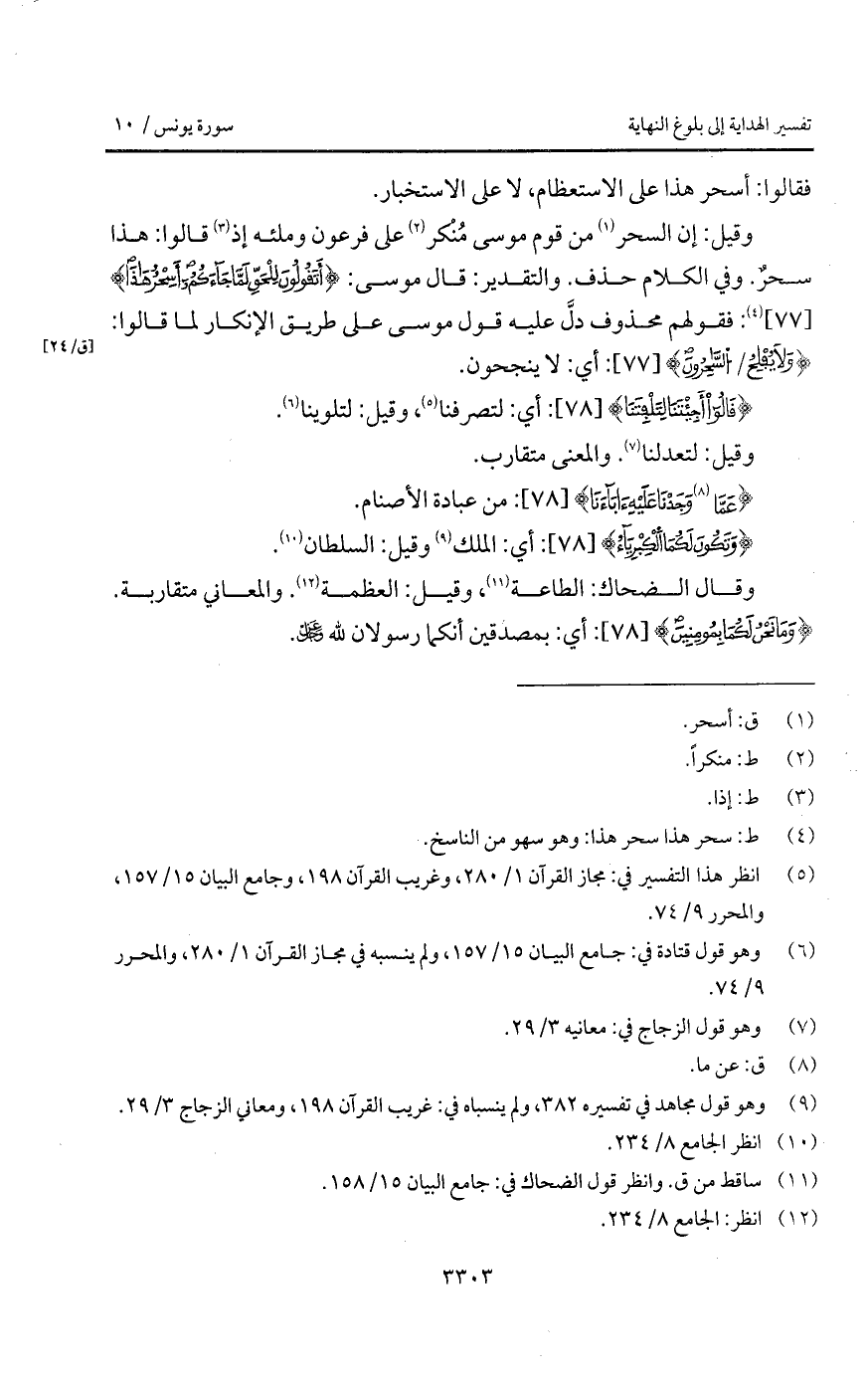 وقيل: إن السحر من قوم موسى مُنْكر على فرعون وملته إذ قالوا: هذا سحرٌ. وفي الكلام حذف. والتقدير: قال موسى: {أَتقُولُونَ لِلْحَقِّ لَمَّا جَآءَكُمْ أَسِحْرٌ هذا}: فقولهم محذوف دلَّ عليه قول موسى على طريق الإنكار لما قالوا: {وَلاَ يُفْلِحُ / الساحرون}: أي: لا ينجحون.