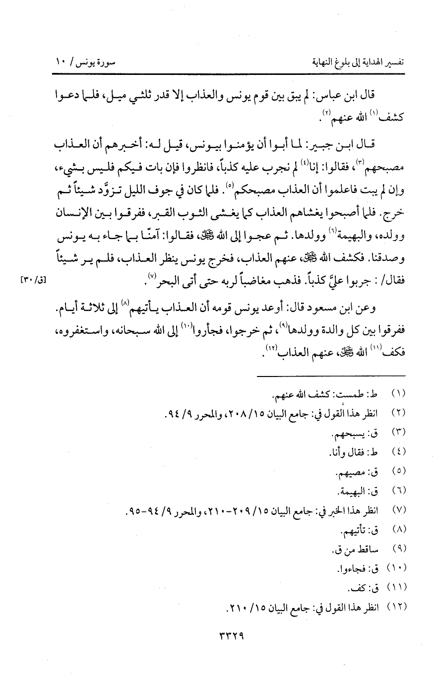 قال ابن جبير: لما أبوا أن يؤمنوا بيونس، قيل له: أخبرهم أن العذاب مصبحهم، فقالولا: إنا لم نجرب عليه كذباً، فانظروا فإن بات فيكم فليس بشيء، وإن لم يبت فاعلموا أن العذاب مصحبكم. فلما كان في جوف الليل تزوَّد شيئاً ثم خرج. فلما أصبحوا يغشاهم العذاب كما يغشى الثوب القبر، ففرقوا بين الإنسان وولده، والبهيمة وولدها. ثم عجوا إلى الله D، فقالوا: آمنّا بما جاء به يونس وصدقنا. فكشف الله D، عنهم العذاب، فخرج يونس ينظر العذاب، فلم ير شيئاً فقال /: جربوا عليَّ كذباً فذهب مغاضباً لربه حتى أتى البحر.