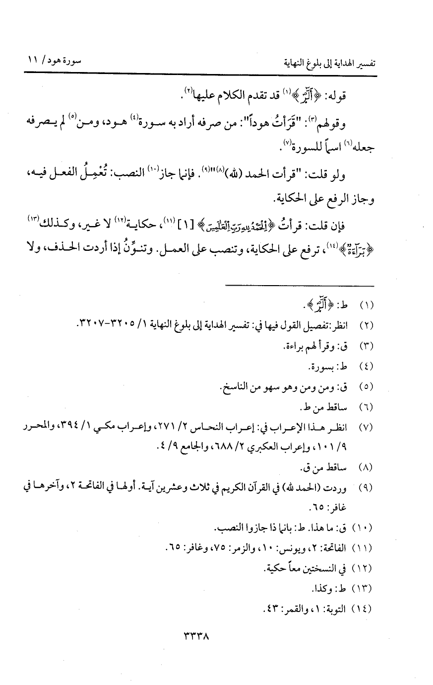 فإن قلت: قرأتُ {الحمد للَّهِ رَبِّ العالمين} [الفاتحة: 2، يونس: 10، الزمر: 75، غافر: 65]، حكاية لا غير، وكذلك {بَرَآءَةٌ} [التوبة: 1، القمر: 43]، ترفع على الحكاية، وتنصب على العمل. وتنوِّنُ إذا أردت الحذف، ولا