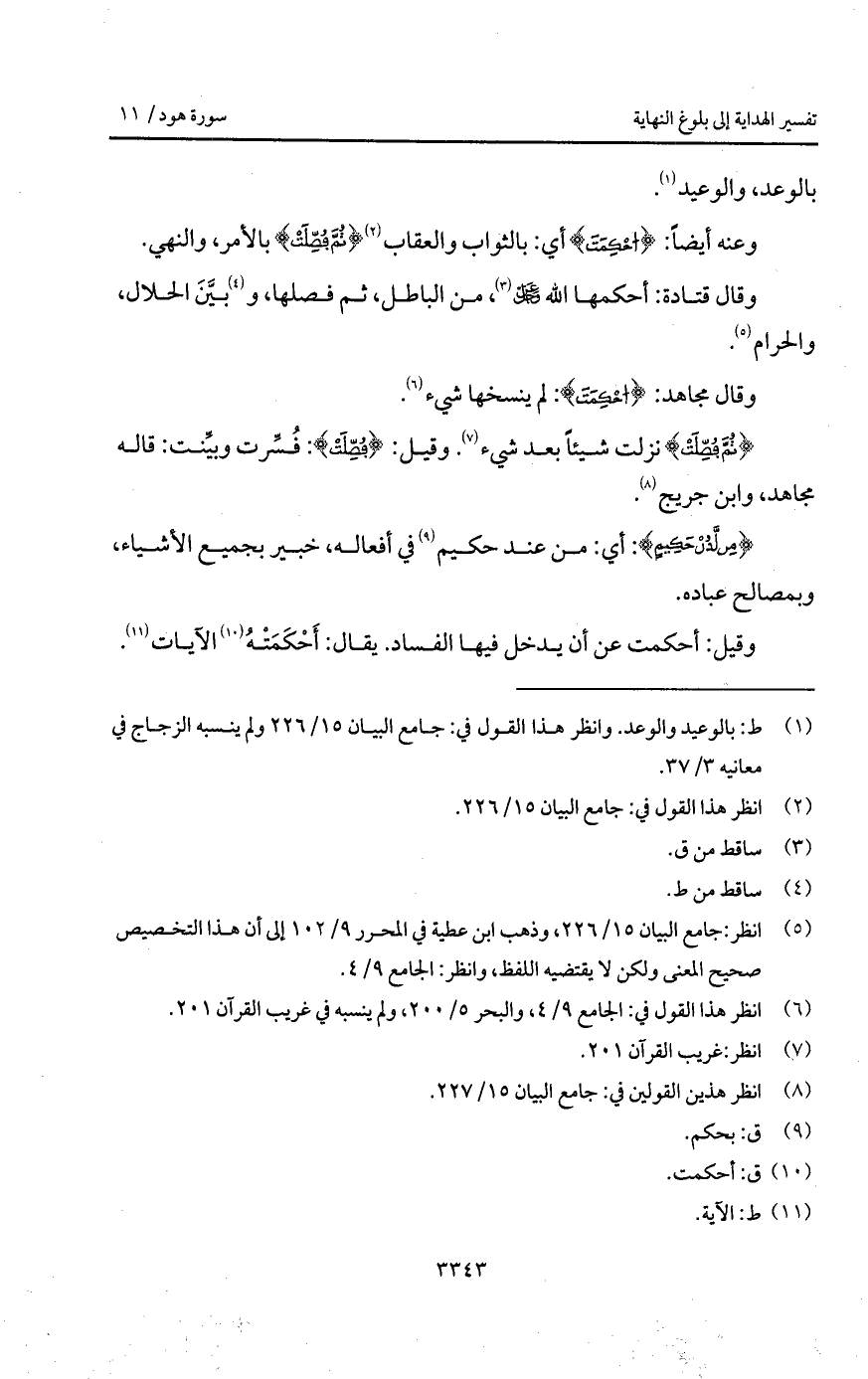 وعنه أيضاً: {أُحْكِمَتْ} أي: بالثواب والعقاب {ثُمَّ فُصِّلَتْ} بالأمر، والنهي.