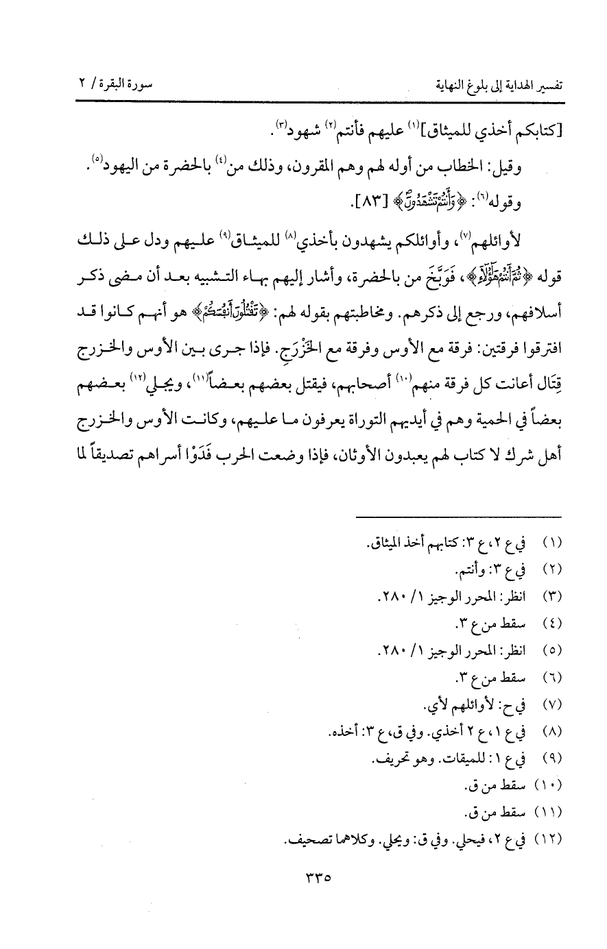 لأوائلهم، وأوائلكم يشهدون بأخذي للميثاق عليهم ودل على ذلك قوله {ثُمَّ أَنْتُمْ هؤلاء}، فَوَبَّخَ من بالحضرة، وأشار إليهم بهاء التشبيه بعد أن مضى ذكر أسلافهم، ورجع إلى ذكرهم. ومخاطبتهم بقوله لهم: {تَقْتُلُونَ أَنْفُسَكُمْ} هو أنهم كانوا قد افترقوا فرقتين: فرقة مع الأوس وفرقة مع الخَزْرَجِ. فإذا جرى بين الأوس والخزرج قِتَال أعانت كل فرقة منهم أصحابهم، فيقتل بعضهم بعضاً، ويجلي بعضهم بعضاً في الحمية وهم في أيديهم التوراة يعرفون ما عليهم، وكانت الأوس والخزرج أهل شرك لا كتاب لهم يعبدون الأوثان، فإذا وضعت الحرب فَدَوْا أسراهم تصديقاً لما