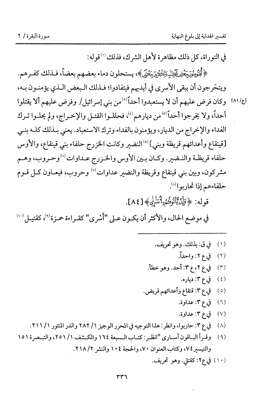 {أَفَتُؤْمِنُونَ بِبَعْضِ الكتاب وَتَكْفُرُونَ بِبَعْضٍ}، يستحلون دماء بعضهم بعضاً، فذلك كفرهم. ويتحَرجون أن يبقى الأسرى في أيديهم فيتفادوا؛ فذلك البعض الذي يؤمنون به، وكان فرض عليهم أن لا يستعبدوا أحداً من بني إسرائيل / وفرض عليهم ألا يقتلوا أحداً، ولا يخرجوا أحداً من ديارهم، فحللوا القتل والإخراج، ولم يحلوا ترك الفداء والإخراج من الديار، ويؤمنون بالفداء وترك الاستعباد. يعني بذلك كله بني [قينقاع وأعدائهم قريظة وبني] النضير وكانت الخزرج حلفاء بني قينقاع، والأوس حلفاء قريظة والنضير. وكان بين الأوس والخزرج عداوات وحروب، وهم مشركون، وبين بني قينقاع وقريظة والنضير عداوات وحروب، فيعاون كل قوم حلفاءهم إذا تحاربوا.