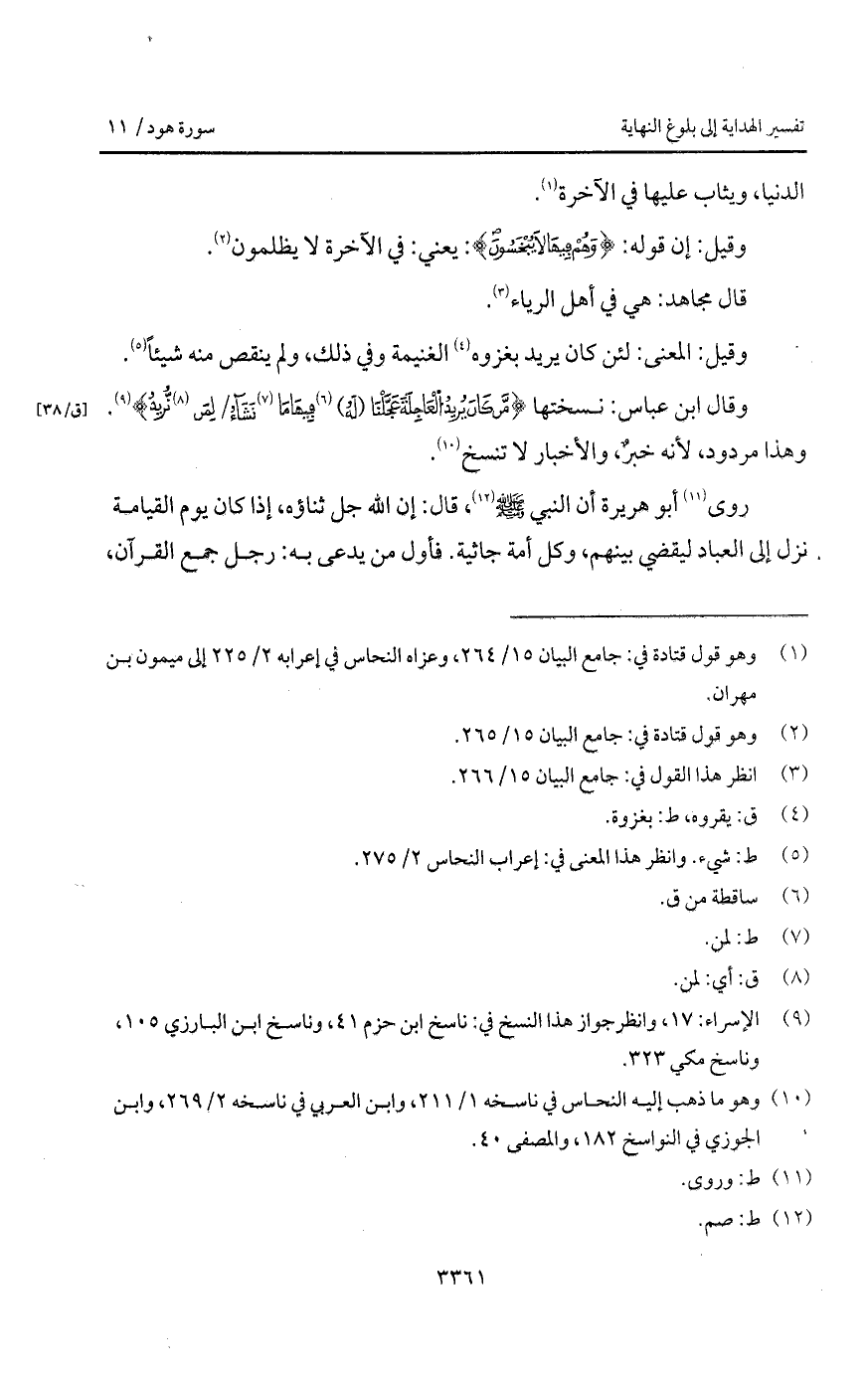 وقال ابن عباس: نسختها {مَّن كَانَ يُرِيدُ العاجلة عَجَّلْنَا (لَهُ) فِيهَا مَا نَشَآءُ / لِمَن نُّرِيدُ} [الإسراء: 17]. وهذا مردود، لأنه خبرٌ، والأخبار لا ننسخ.