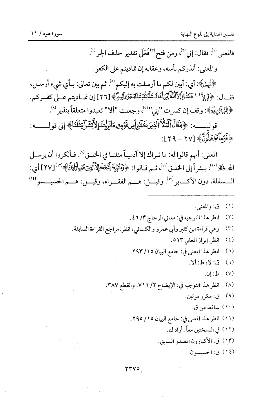{مُّبِينٌ}: أي: أبين لم ما أرسلت به إليكم. ثم بين تعالى: بأي شيء أرسل، فقال: {أَن لاَّ تعبدوا إِلاَّ الله إني أَخَافُ عَلَيْكُمْ عَذَابَ يَوْمٍ أَلِيمٍ} إن تماديتم على كفركم. {إلى قَوْمِهِ}: وقف إن كسرت " إني "، وجعلت " ألا " تعبدوا متعلقاً بنذير.