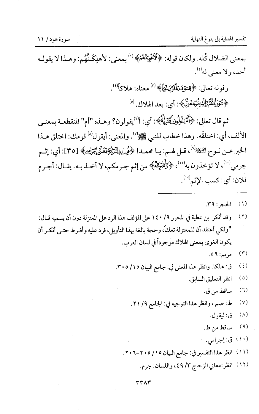 ثم قال تعالى: {أَمْ يَقُولُونَ افتراه}: أي: أيقولون؟ وهذه " أم " المنقطعة بمعنى الألف، أي: اختلقَه. وهذا خطاب للنبي A. والمعنى أيقول قومك: اختلق هذا الخبر عن نوح عليه السلام، قل لهم: يا محمد! {قُلْ إِنِ افتريته فَعَلَيَّ إِجْرَامِي}: أي: إثم جرمي، لا تؤاخذون به، {وَأَنَاْ برياء} من إثم جرمكم، ولا آخذ به. يقال: أجرم فلان: أي: كسب الإثم.