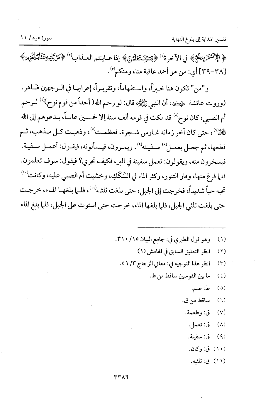 و" من " تكون هنا خبراً، واستفهاماً، وتقريراً، إعرابها في الوجهين ظاهر. (وروت عائشة Bها، أن النبي A، قال: " لو رحم الله (أحداً من قوم نوح) لرحم أم الصبي، كان نوح قد مكث في قومه ألف سنة إلا خمسين عاماً، يدعوهم إلى الله D، حتى كان آخر زمانه غارس شجرة، فعظمت، وذهبت كل مذهب، ثم قطعها، ثم جعل يعمي سفينته. ويمرون، فيسألونه، فيقول: أعمل سفينة. فيسخرون منه، ويقولون: تعمل سفينة في البر، فكيف تجري؟ فيقول: سوف تعلمون. فلما فرغ منها، وفار التنور، وكثر الماء في السِّكَكِ، وخشيت أم الصبي عليه، وكانت تحبه حباً شديداً، فخرجت إلى الجبل، حتى بلغت ثلثي الجبل، فلما بلغها الماء، خرجت حتى استوت على الجبل، فلما بلغ الماء