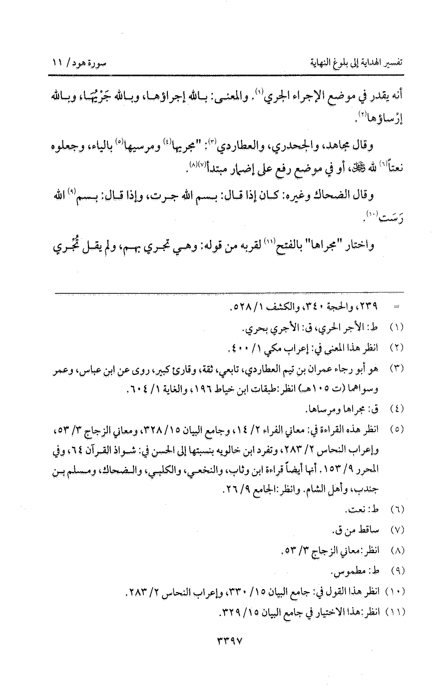 وقال مجاهد، والجحدري، والعطاردي: " مجريها ومرسيها بالياء، وجعلوه نعتاً لله D، أو في موضع رفع على إضمار مبتدأ.