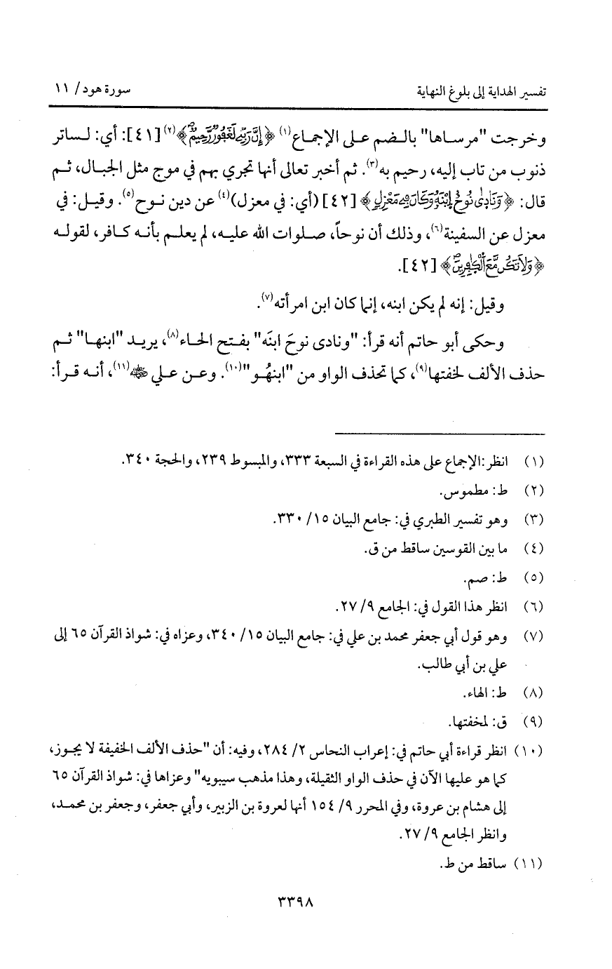 وحكى أبو حاتم أنه قرأ: " ونادى نوحَ ابنَه " بفتح الحاء، يريد " ابنها " ثم حذف الألف لخفتها، كما تحذف الواو من " ابنهُو ". وعن علي Bهـ، أنه قرأ: