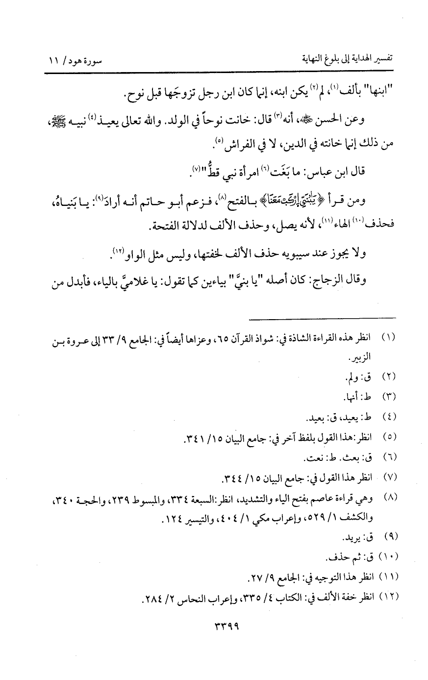 وعن الحسن Bهـ، أنه قال: خانت نوحاً في الولد. والله تعالى يعيذ نبيه A، من ذلك إنما خانته في الدين، لا في الفراش.