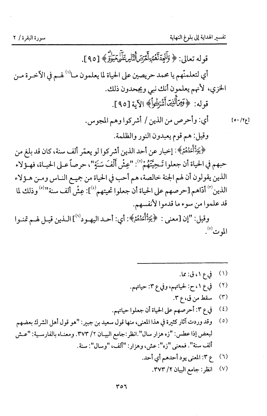 {يَوَدُّ أَحَدُهُمْ}: إخبار عن أحد الذين أشركوا لو يعمّر ألف سنة، كان قد بلغ من حبهم في الحياة أن جعلوا تَحِيَّتَهُمْ: " عِشْ أَلْفَ سَنَةٍ "، حرصاً على الحياة، فهؤلاء الذين يقولون أن لهم الجنة خالصة، هم أحب في الحياة من جميع الناس ومن هؤلاء الذين أدّاهم [حرصهم على الحياة أن جعلوا تحيتهم]: عِشْ ألف سنة " وذلك لما قد علموا من سوء ما قدموا لأنفسهم.