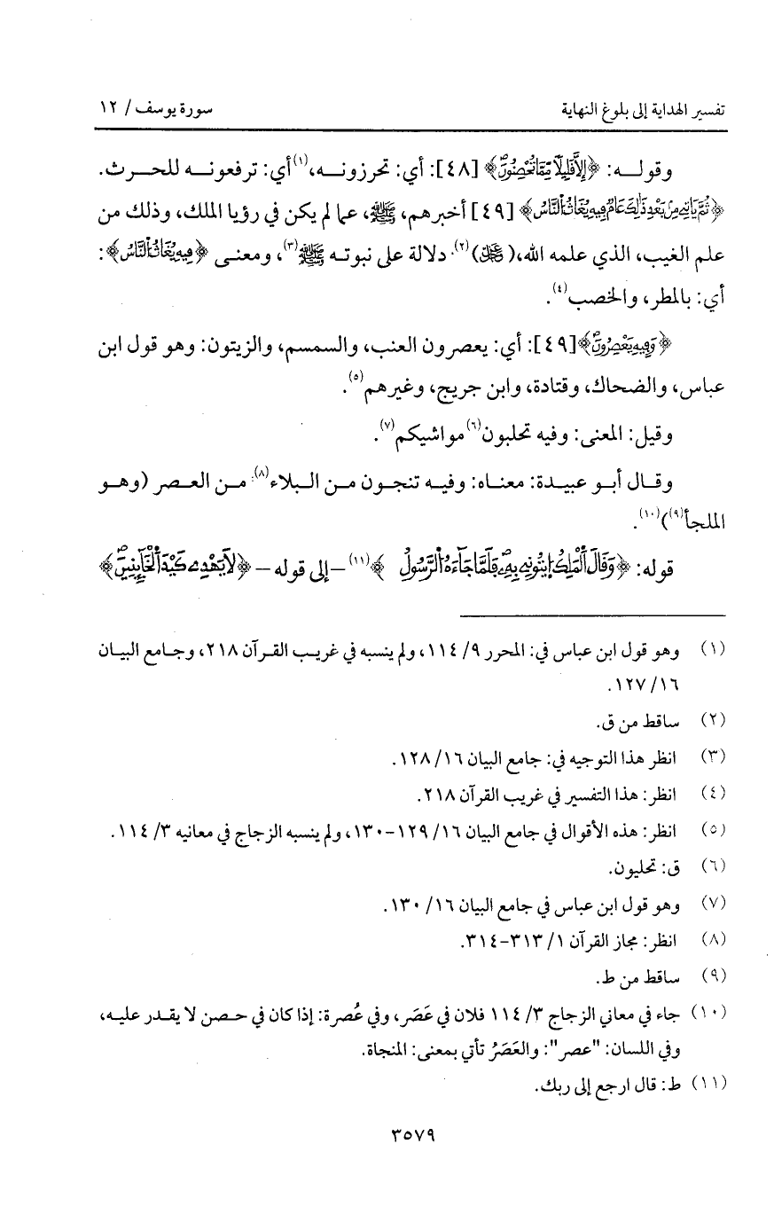 وقوله: {إِلاَّ قَلِيلاً مِّمَّا تُحْصِنُونَ}: أي: تحزرونه، أي: ترفعونه للحرث. {ثُمَّ يَأْتِي مِن بَعْدِ ذلك عَامٌ فِيهِ يُغَاثُ الناس} أخبرهم، A، عما لم يكن في رؤيا الملك، وذلك من علم الغيب، الذي علمه الله، ( D) دلالة على نبوته A، ومعنى {فِيهِ يُغَاثُ الناس}: أي: بالمطر، والخصب.