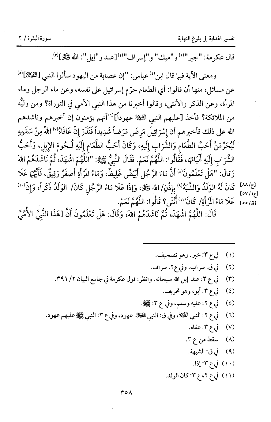 ومعنى الآية فيما قال ابن عباس: " إن عصابة من اليهود سألوا النبي [عليه السلام] عن مسائل، منها أن قالوا: أي الطعام حرّم إسرائيل على نفسه، وعن ماء الرجل وماء المرأة، وعن الذكر والأنثى، وقالوا أخبرنا من هذا النبي الأمي في التوراة؟ ومن وليُّه من الملائكة؟ فأخذ [عليهم النبي عليه السلام عهوداً] أنهم يؤمنون إن أخبرهم وناشدهم الله على ذلك فأخبرهم أن إِسْرَائِيلَ مَرِضَ مَرَضاً شَدِيداً فَنَذَرَ إِنْ عَافَاهُ اللهُ مِنْ سَقَمِهِ لَيُحَرِّمَنَّ أَحَبَّ الطَّعَامِ وَالشَّرَابِ إِلَيهِ، وَكَانَ أَحَبُّ الطَّعَامِ إِلَيْهِ لُحُومَ الإِبِلِ، وأَحَبُّ الشَّرَابِ إِلَيْهِ أَلْبَانَهَا، فَقَالُوا: اللَّهُمَّ نَعَمْ. فَقَالَ النَّبِيُّ A: " اللَّهُمّ اشْهَدْ، ثُمَّ نَاشَدَهُمْ اللهَ وَقالَ: " هَلْ تَعْلَمُونَ أَنَّ مَاءَ الرَّجُل أَبْيَضٌ غَلِيظٌ، وَمَاءُ المَرْأَةِ أَصْفَرٌ رَقِيقٌ، فَأَيُّهُمَا عَلاَ كَانَ لَهُ الوَلَدُ وَالشَّبَهُ بِإِذْنِ / الله D، وَإذَا عَلاَ مَاءُ الرَّجُلِ كَانَ / الوَلَدُ ذَكَراً، وَإِِنْ عَلاَ مَاءُ المَرْأَةِ / كَانَ أُنْثَى؟ قَالُوا: اللُّهُمَّ نَعَمْ.