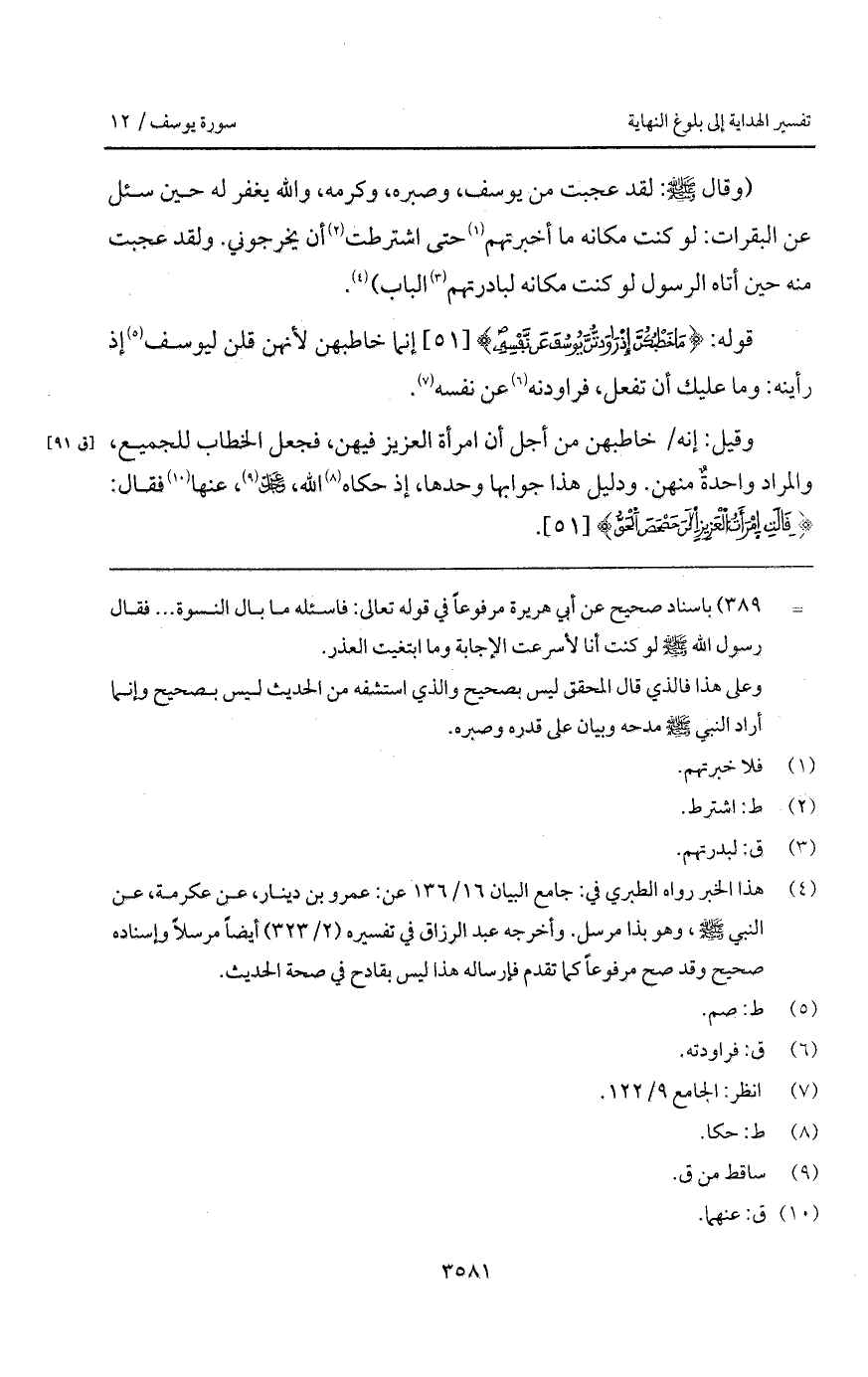 (وقال A: " لقد عجبت من يوسف، وصبره، وكرمه، والله يغفر له حين سئل عن البقرات: لو كنت مكانه ما أخبرتهم حتى اشترطت أن يخرجوني. ولقد عجبت منه حين أتاه الرسول لو كنت مكانه لبادرتهم الباب "
