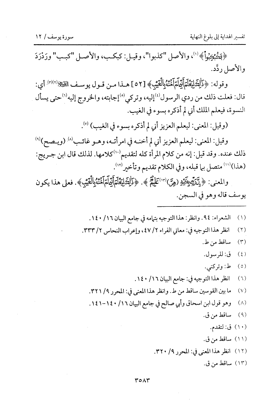 والمعنى: {إِنَّ رَبِّي بِكَيْدِ (هِنَّ) عَلِيمٌ}. {ذلك لِيَعْلَمَ أَنِّي لَمْ أَخُنْهُ بالغيب}. فعلى هذا يكون يوسف قاله وهو في السجن.