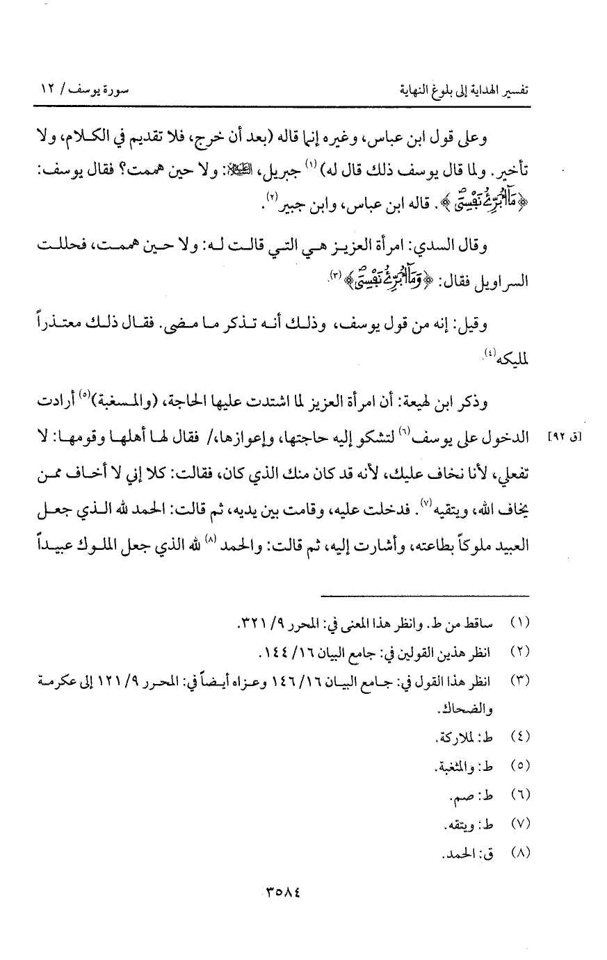 وعلى قول ابن عباس، وغيره إنما قاله (بعد أن خرج، فلا تقديم في الكلام، ولا تأخير. ولما قال يوسف ذلك قال له) جبريل، عليه السلام: ولا حين هممت؟ فقال يوسف: {وَمَآ أُبَرِّىءُ نفسي} [يوسف: 53]. قاله ابن عباس، وابن جبير.