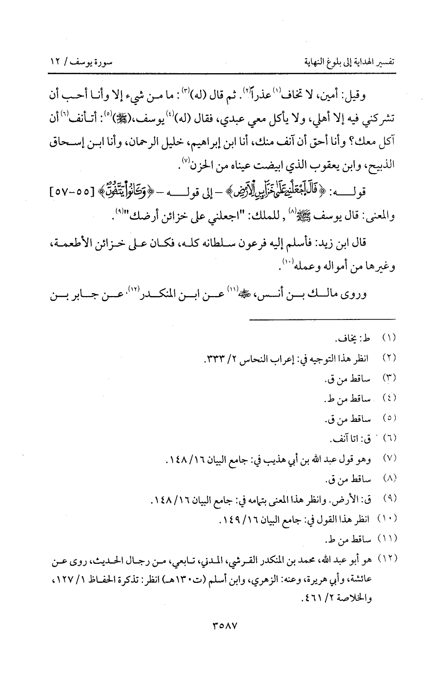 وقيل: أمين، لا تخاف عذراً. ثم قال (له): ما من شيء إلا وأنا أحب أن تشركني فيه إلا أهلي، ولا يأكل معي عبدي، فقال (له) يوسف، ( A) : أتأنف أن آكل معك؟ وأنا أحق أن آنف منك، أنا ابن إبراهيم، خليل الرحمان، وأنا ابن إسحاق الذبيح، وابن يعقوب الذي ابيضت عيناه من الحزن.