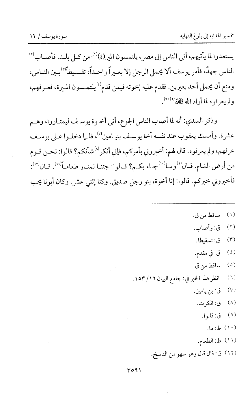 وذكر السدي: أنه لما أصاب الناس الجوع، أتى أخوة يوسف ليتماروا، وهم عشرة: وأمسك يعقوب عند نفسه أخا يوسف بنيامين، فلا دخلوا على يوسف عرفهم، ولم يعرفوه. قال لهم: أخبروني بأمركم، فأني أنكر شأنكم؟ قالوا: نحن قوم من أرض الشام. قال وما جاء بكم؟ قالوا: جئنا نمتار طعاناً. قال: فأخبروني خبركم. قالوا: إنا أخوة، بنو رجل صديق. وكنا اثني عشر. وكان أبونا يحب