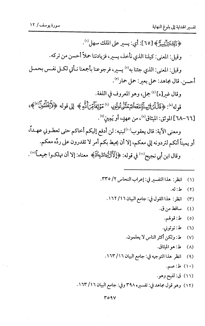ومعنى الآية: قال بعقوب لبنيه: لن أدفع إليكم أخاكم حتى تعطوني عهداً، أو يميناً أنكم لتردونه إلي معكم، إلا أن يحيط بكم أمر لا تقدرون على ردِّه معكم.