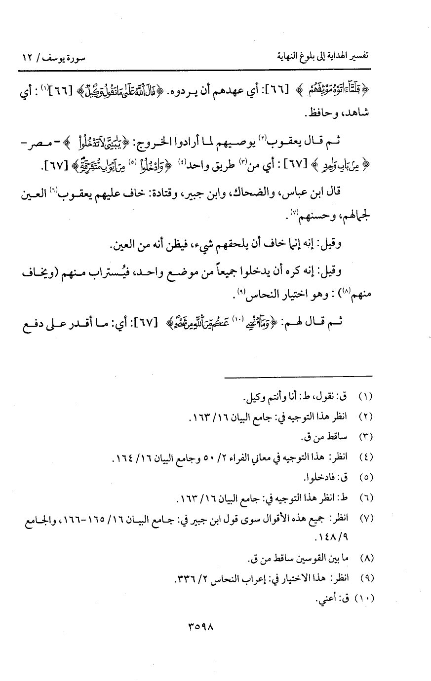ثم قال يعقوب يوصيهم لما أرادوا الخروج: {يابني لاَ تَدْخُلُواْ} - مصر - {مِن بَابٍ وَاحِدٍ}: أي من طريق واحد {وادخلوا مِنْ أَبْوَابٍ مُّتَفَرِّقَةٍ}.