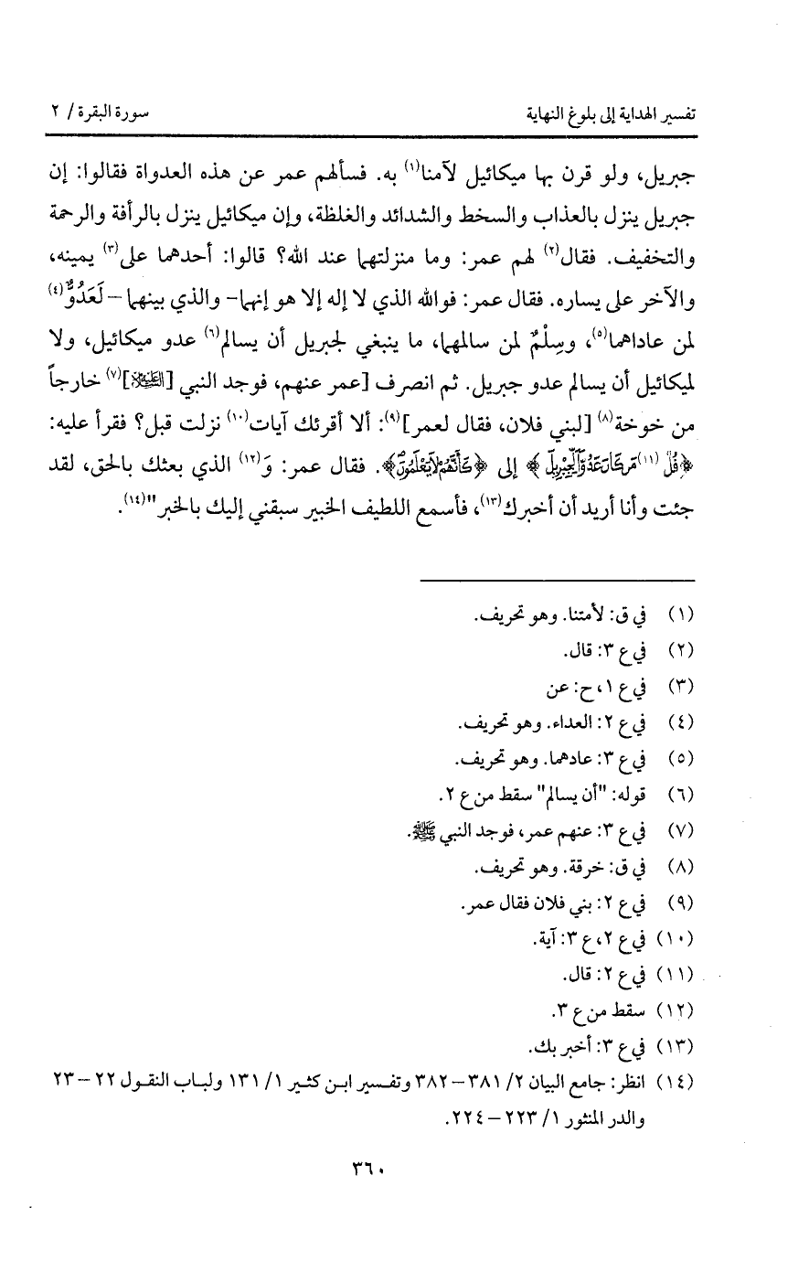 جبريل، ولو قرن بها ميكائيل لآمنا به. فسألهم عمر عن هذه العدواة فقالوا: إن جبريل ينزل بالعذاب والسخط والشدائد والغلظة، وإن ميكائيل ينزل بالرأفة والرحمة والتخفيف. فقال لهم عمر: وما منزلتهما عند الله؟ قالوا: أحدهما على يمينه، والآخر على يساره. فقال عمر: فوالله الذي لا إله إلا هو إنهما - والذي بينهما - لَعَدُوٌّ لمن عاداهما، وسِلْمٌ لمن سالمهما، ما ينبغي لجبريل أن يسالم عدو ميكائيل، ولا لميكائيل أن يسالم عدو جبريل. ثم انصرف [عمر عنهم، فوجد النبي [عليه السلام] خارجاً من خوخة [لبني فلان، فقال لعمر]: ألا أقرئك آيات نزلت قبل؟ فقرأ عليه: {قُلْ مَن كَانَ عَدُوّاً لِّجِبْرِيلَ} إلى {كَأَنَّهُمْ لاَ يَعْلَمُونَ}.