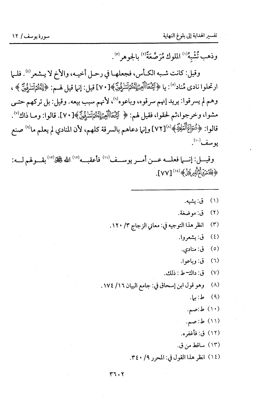 وقيل: كانت شبه الكأس، فجعلها في رحل أخيه، والأخ لا يشعر. فلما ارتحلوا ناجى مناد: يا {أَيَّتُهَا العير إِنَّكُمْ لَسَارِقُونَ} قيل: إنما قال لهم: {إِنَّكُمْ لَسَارِقُونَ}، وهم لم يسرقوا: يريد إنهم سرقوه، وباعوه، لأنهم سبب بيعه. وقيل: بل تركهم حتى مشوا، وخرجوا، ثم لحقوا، فقيل لهم: {أَيَّتُهَا العير إِنَّكُمْ لَسَارِقُونَ}. قالوا: وما ذاك. قالوا: {صُوَاعَ الملك} وإنما دعاهم بالسرقة كلهم لأن المنادي لم يعلم ما صنع يوسف.