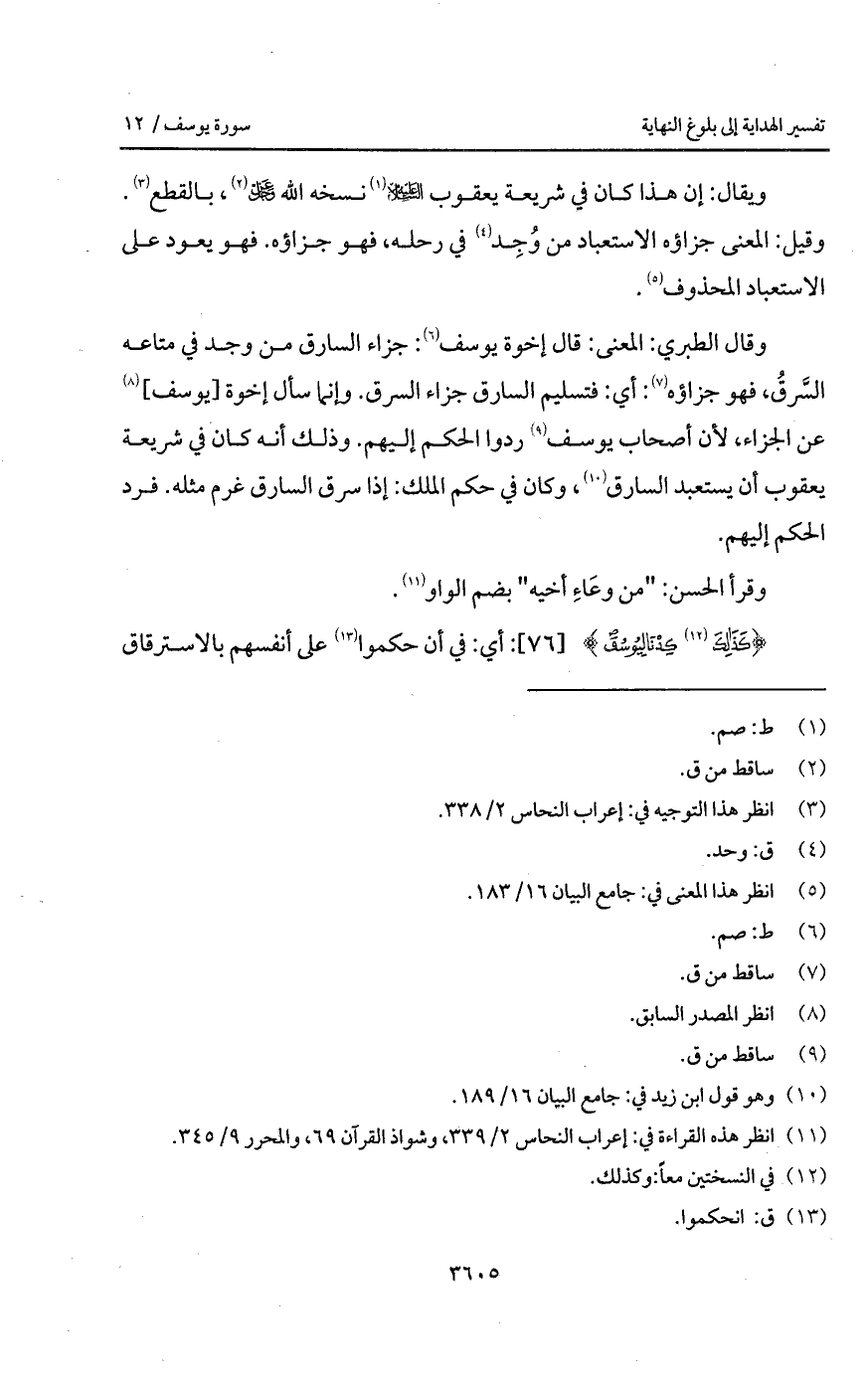 وقال الطبري: المعنى: قال إخوة يوسف: جزاء السارق من وجد في متاعه السَّرقُ، فهو جزاؤه: أي: فتسليم السارق جزاء السرق. وإنما سأل إخوة [يوسف] عن الجزاء، لأن أصحاب يوسف ردوا الحكم إليهم. وذلك أنه كان في شريعة يعقوب أن يستعبد السارق، وكان في حكم الملك: إذا سرق السارق غرم مثله. فرد الحكم إليهم.