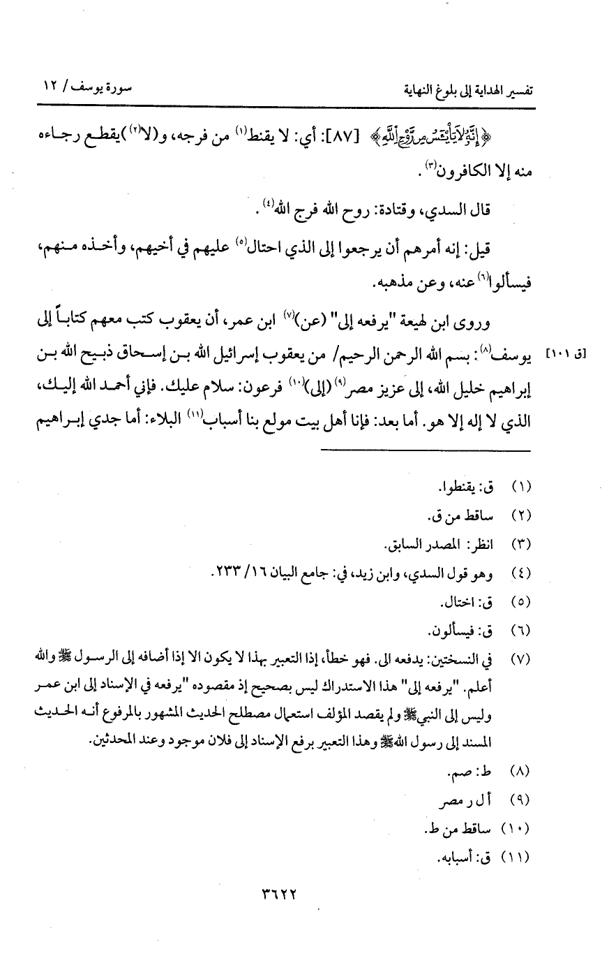وروى ابن لهيعة " يرفعه إلى " (عن) ابن عمر، أن يعقوب كتب معهم كتاباً إلى يوسف: بسم الله الرحمن الرحيم / من يعقوب إسرائيل الله بن إسحاق ذبيح الله بن إبراهيم خليل الله، إلى عزيز مصر (إلى) فرعون: سلام عليك. فإني أحمد الله إليك، الذي لا إله إلا هو. أما بعد: فإنا أهل بيت مولع بنا أسباب البلاء: أما جدي إبراهيم